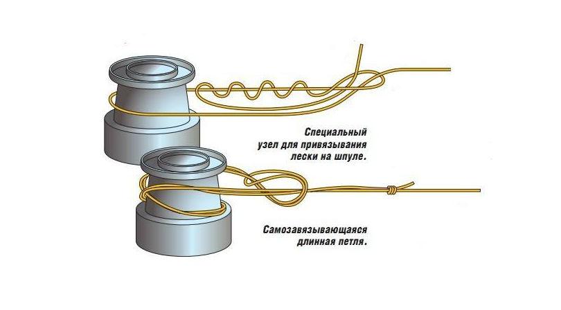 Первым этапом оснащения катушки леской является закрепление лесы на шпуле. Многие рыболовы не закрепляют леску, уповая на то, что нижние слои использоваться не будут, но это не совсем правильный подход. Со временем верхний рабочий слой будет изнашиваться и постепенно укорачиваться. Существует множество способов привязки, но основное распространение получил специально разработанный узел и самозатягивающаяся петля: