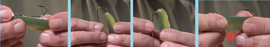 Жало должно максимально быть прижато к телу приманки. Второй вариант офсетника нужно использовать для приманки формы shad – с широким брюшком.