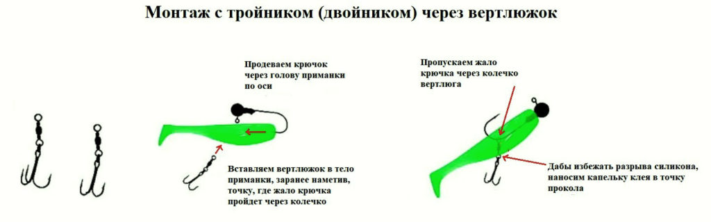 При монтаже силиконовой приманки на двойной крючок сперва пронизывается брюшко (только одной иглой), затем она протягивается до ушка, которое необходимо аккуратно протиснуть через внутренность наживки до шейки.