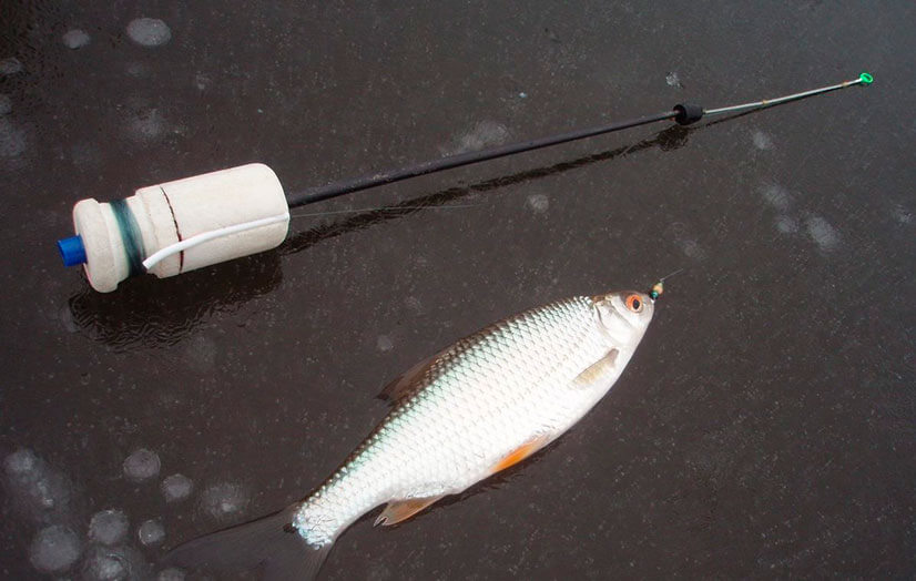 В отличие от летного варианта имеет меньшие размеры, так как рыбачить приходится рядом с лункой, и необходимости в дальних забросах нет. Ловить на такую удочку можно леща, карася, окуня, плотву, но меньших размеров, нежели летом.