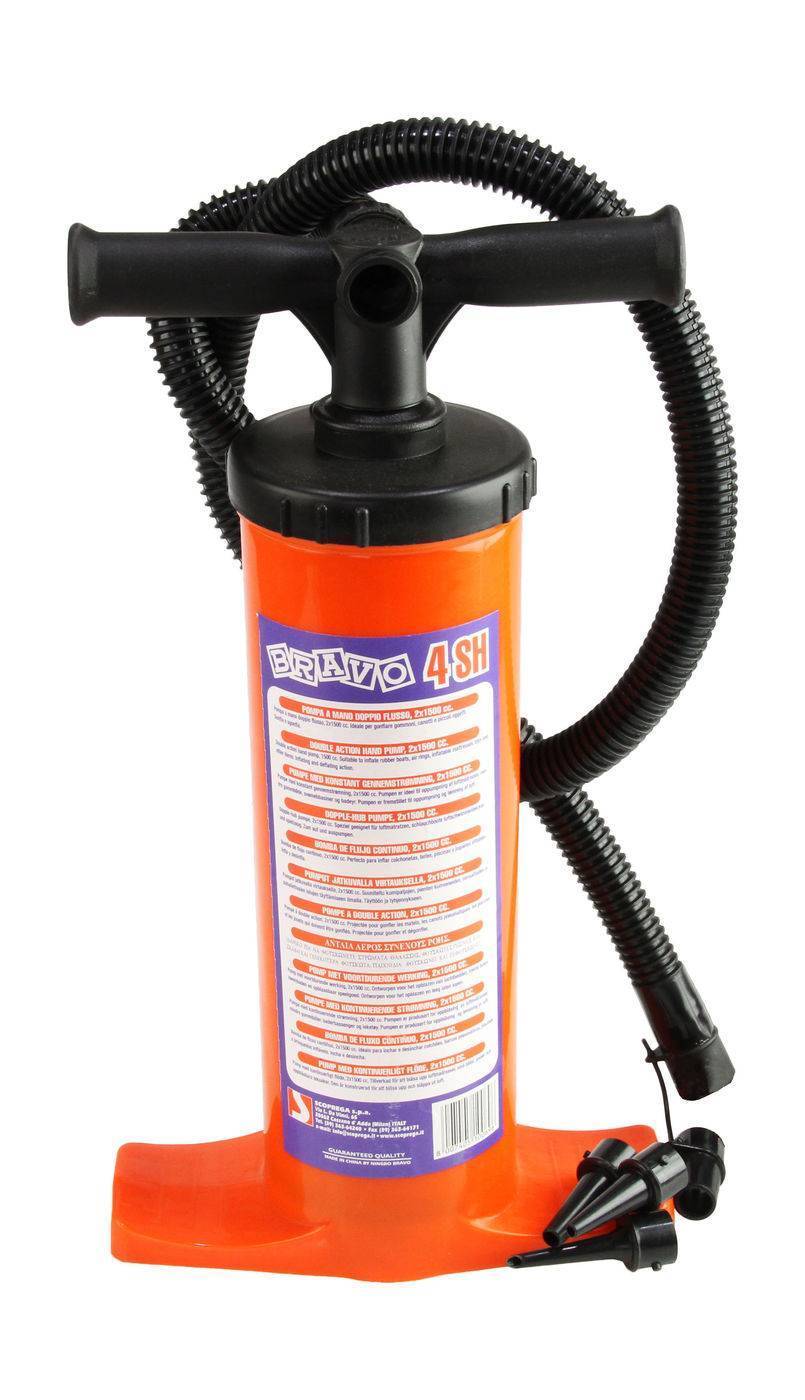 Bravo 9. Ножная помпа, которая чаще всего встречается в комплекте с приобретенной ПВХ лодкой. Две камеры, рабочий потолок 1000 мБар, усовершенствованный шланг, набор переходников. Качество мехов и пластика рабочих площадок, на высоте. Стоимость 1200–1500 рублей.