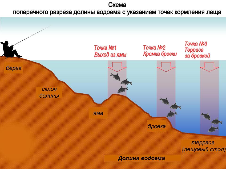 - Бровка — граница двух плоскостей, наклонной и горизонтальной. Именно сюда приплывает основная масса рыб в поисках пищи.