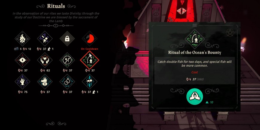 Если разблокировать этот ритуал и затем использовать его, то количество рыбы, которую Ягненок поймает на удочку, удвоится на целых два дня. Кроме того, он значительно увеличивает скорость спавна редких рыб, что делает его идеальным инструментом для ускорения выпадения чрезвычайно редких омаров и кальмаров. Если игроки активируют этот ритуал и отправятся в Проход Пилигрима, они, скорее всего, соберут больше одного омара и кальмара за одну рыбалку. Сам ритуал стоит 75 костей, но игрокам, разблокировавшим более дешевые ритуалы Божественного вдохновения, придется заплатить только 37 костей.