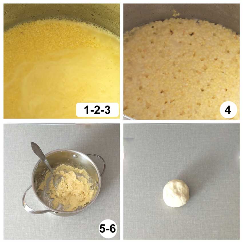 Даем немного остыть нашему пюре. Затем обмакивая руки в масле, формируем готовую смесь на небольшие шарики и закладываем в эмалированную миску. Даем им застыть, периодически переворачивая их.