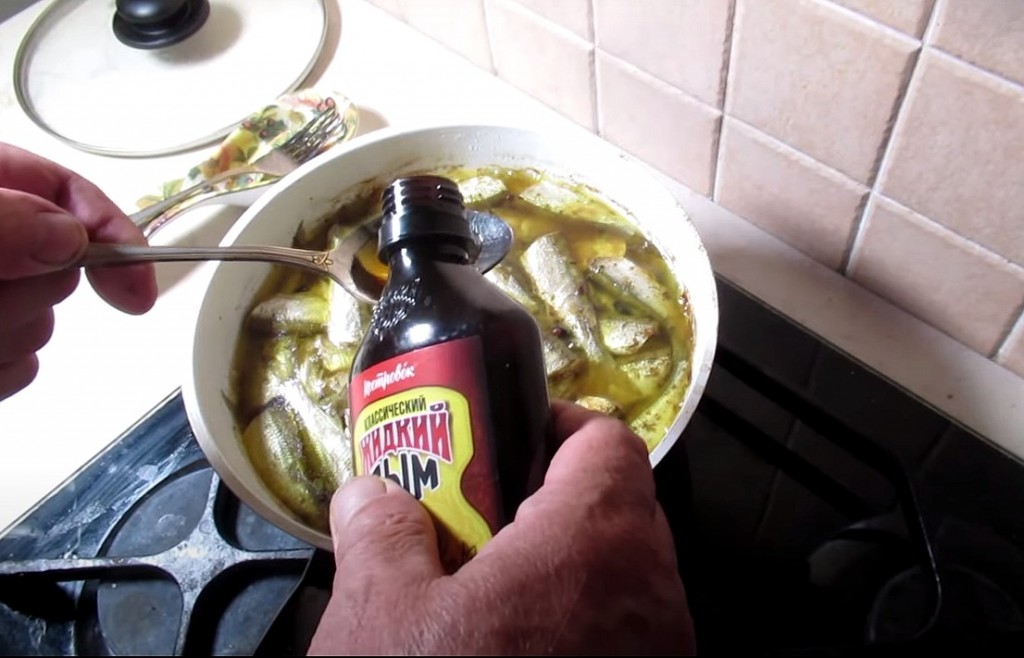 6. Прошло 3 часа. Открываем крышку сковороды и пробуем одну рыбку. Кости должны полностью «расплавиться» и их не должно чувствоваться. Если рыба готова, то добавляем равномерно по всей поверхности 1 столовую ложку «Жидкого дыма», закрываем опять крышкой, выключаем огонь и ждём пока шпроты полностью не остынут. За это время рыба должна пропитаться запахом копчения.