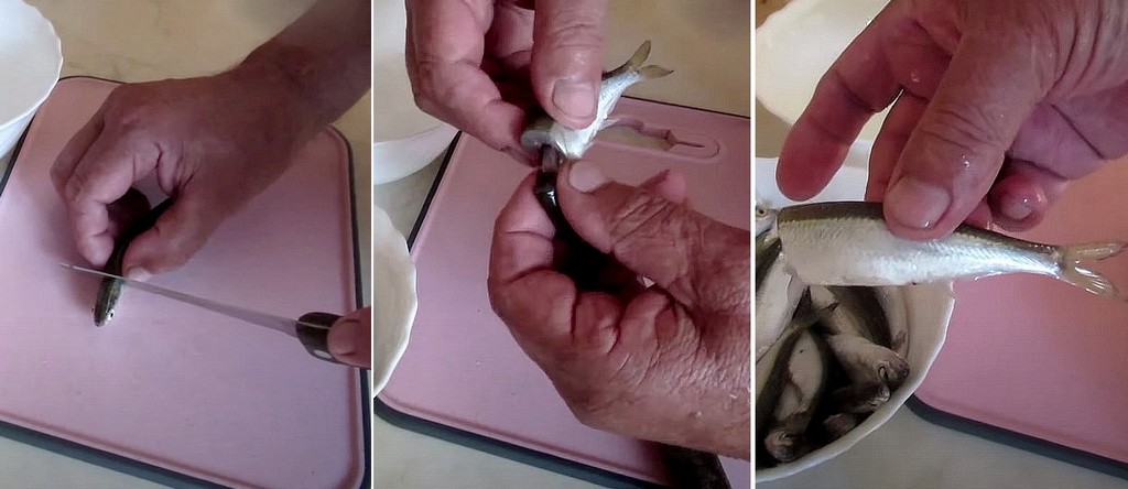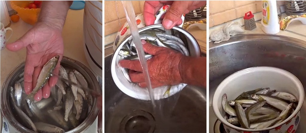 Рыбок нужно тщательно промыть и избавиться от голов и требухи. Не забудьте вытащить и черную пленку, иначе блюдо будет горчить. После чистки промываем рыбу еще раз.