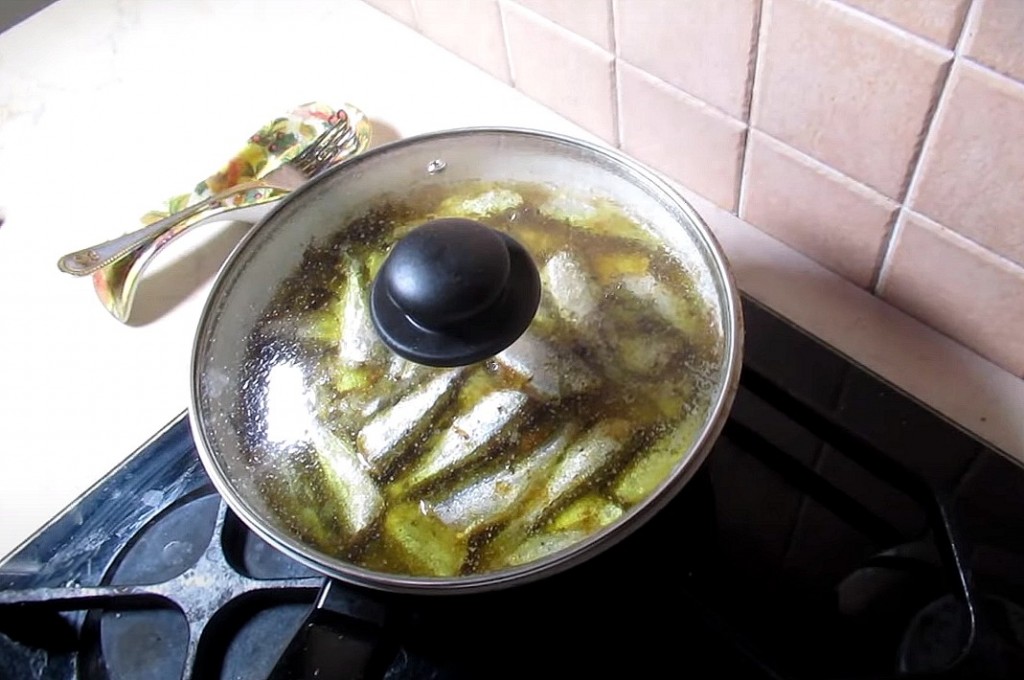 5. Закрываем сковороду крышкой, убавляем огонь до минимума и томим наши шпроты минимум 3 часа. Если делаете это в духовке, то время будет зависеть от её производительности.