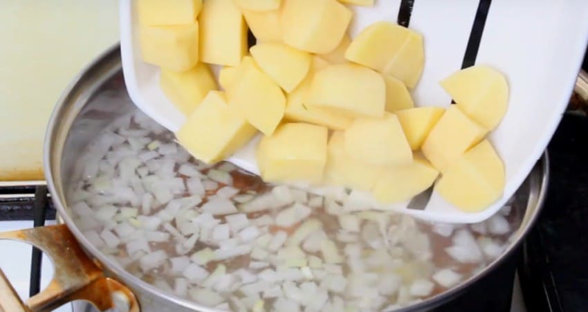 - Запустить в бульон крупу и порезанный на кубики картофель.