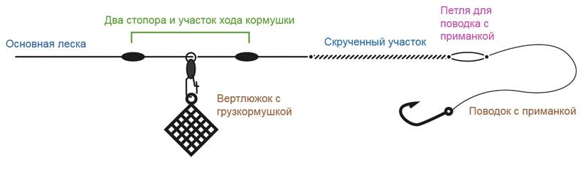 Монтаж “Инлайн” очень напоминает оснастку асимметричная петля с одной лишь особенностью, что в инлайне можно регулировать длину свободного хода кормушки