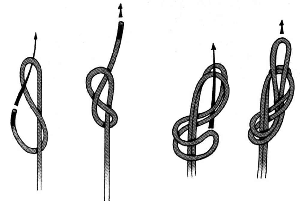Этот же узел применяется для привязывания любого металлического элемента к оснастке, будь то карабин, вертлюжок или даже крючок за цевье. Вот последовательность выполнения узла клинч:
