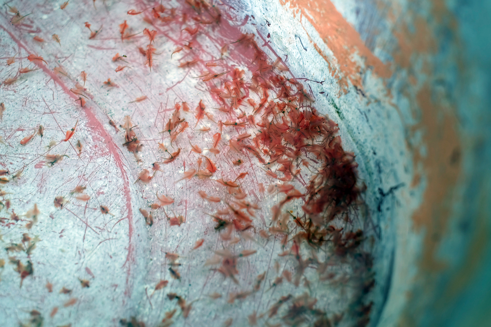 Когда из яиц вылупляются науплии, то на третий день им нужна пища для роста. Это специальный корм – микро-водоросли. Но есть альтернативные варианты – мука, яичный желток, соевый порошок. В аквариум подается такое количество, которое не загрязнит воду. Нужно отслеживать, насколько быстро пища поглощается.