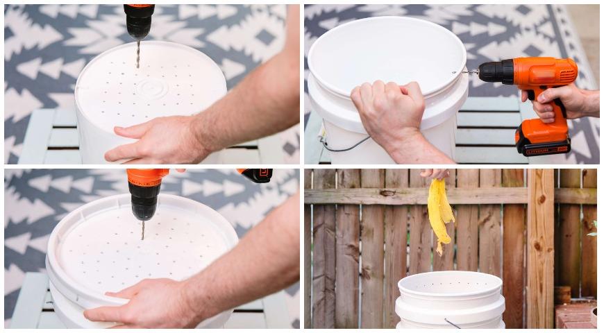 2 В обоих ведрах просверлите также небольшие отверстия на расстоянии 3 см по всей окружности в верхней части. Это обеспечит аэрацию, которая поможет быстрому разложению.