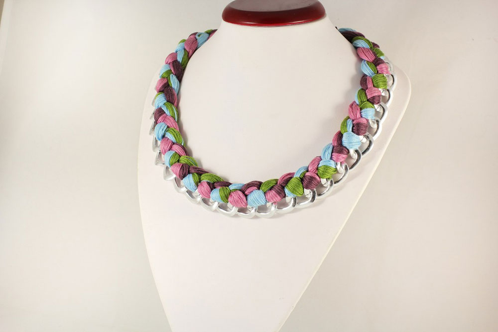- К краю нижней косички и по бокам последующих прикрепите крупную цепочку. Прикрепите к соединительным кольцам карабин. Украшение будет завязываться на ленты, привяжите к карабину края лент и обмотайте их вокруг концов косичек. Все, чокер из ниток мулине готов.