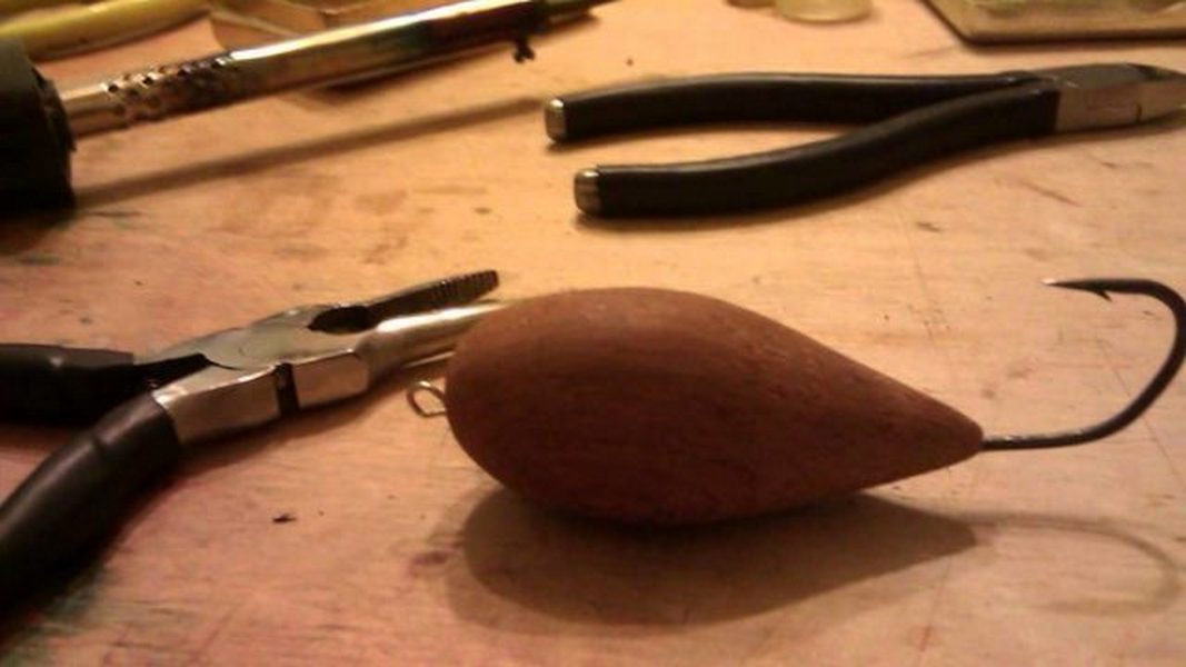 Когда пробка получила форму яйца начинается самое интересное – её огрузка и монтаж крючка. Это не слишком сложное, но кропотливое занятие, для начала необходимо вооружиться одинарным крючком и небольшим отрезком проволоки.