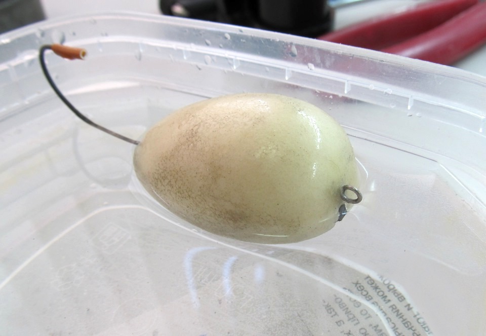 Лучше всего проверить плавучесть приманки в домашних условиях в тазике с водой, так как рыбаки часто перегружают хорватское яйцо своими руками и по приезду на водоем расстраиваются. Но для чистоты проверки необходимо собрать всю приманку. Необходимо вставить полученную заготовку со свинца и крючка в пропил яйца.