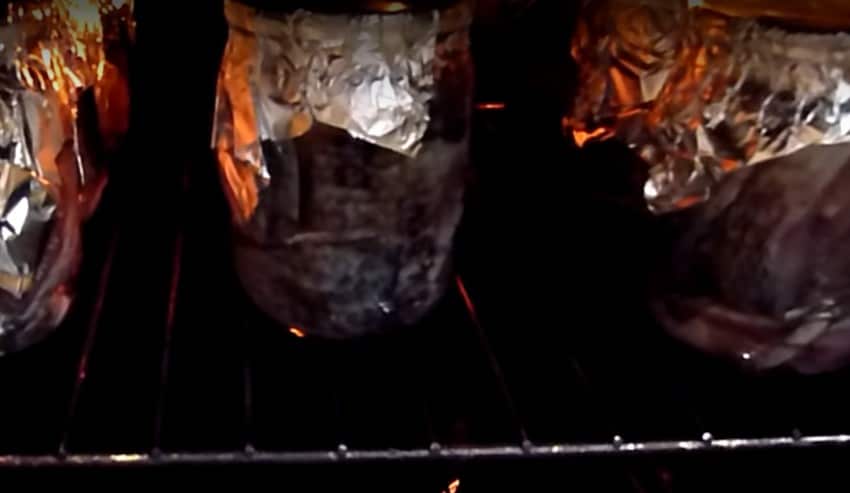 - Банки укрывают фольгой, отправляют в духовой шкаф, предварительно прогретый до 150 градусов.