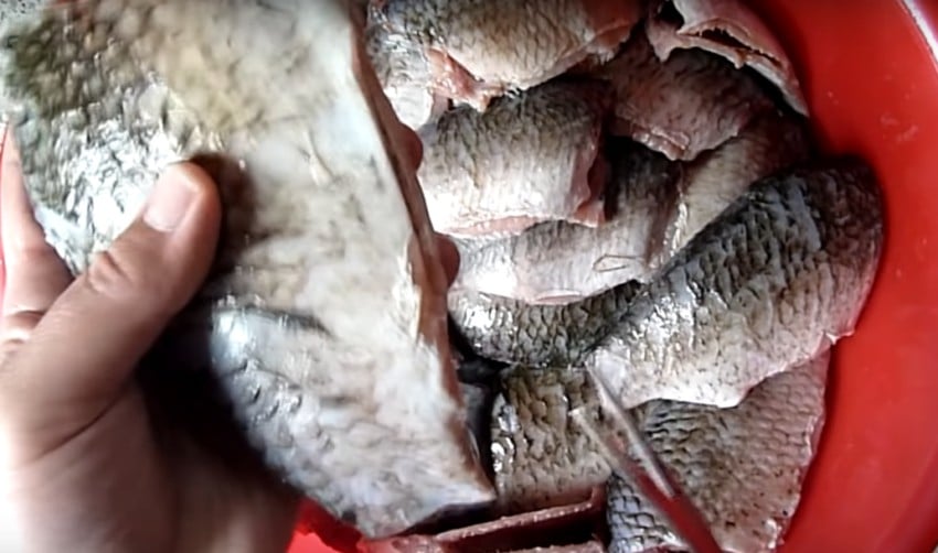 1. Возьмите карпа средних размеров и отличного качества, очистите от чешуи и выпотрошите. Промойте водой и дайте воде хорошо стечь. Удалите голову, хвостовой и боковые плавники. Разрежьте карпа вдоль хребта, а затем порежьте на небольшие кусочки по 3–3,5 см вдоль ребер.