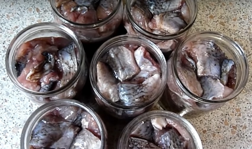 Спустя полтора часа заполните тару со специями настоявшейся щукой. Старайтесь рыбку укладывать плотно, чтобы оставалось как можно меньше пустого места. При необходимости закуску можно слегка придавить. Если вы желаете сделать консервированную щуку в томате, то на этом этапе разлейте по банкам еще и томатный сок.