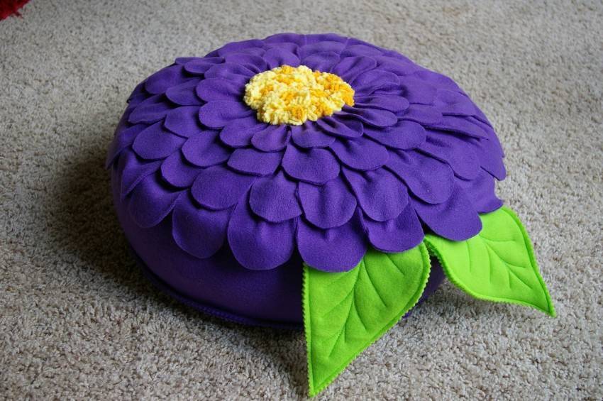 После окончания процесса сшивают оставшиеся не сшитыми сегменты, а по центру на месте стыков лепестков с обеих сторон пуфика пришивают по пуговице.