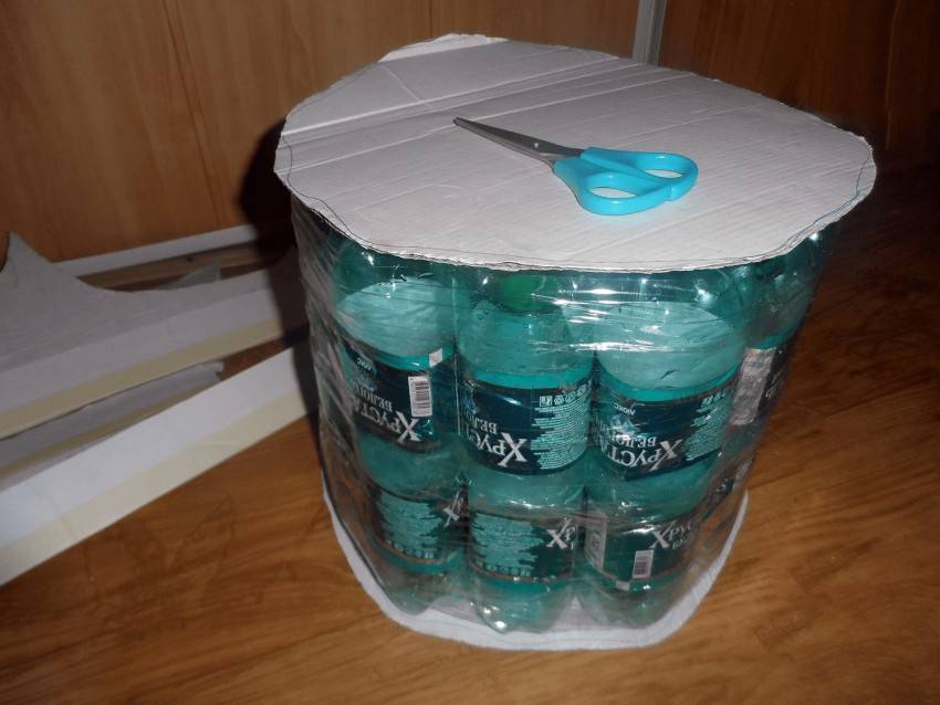 Рекомендуется соединять по одной бутылке, чтоб конструкция была более прочной. Когда все элементы соединены, необходимо из картона создать дно и верх конструкции. Для этого нужно вырезать 2 круга. Картонки с помощью скотча тщательно приматываются на верх и низ конструкции.