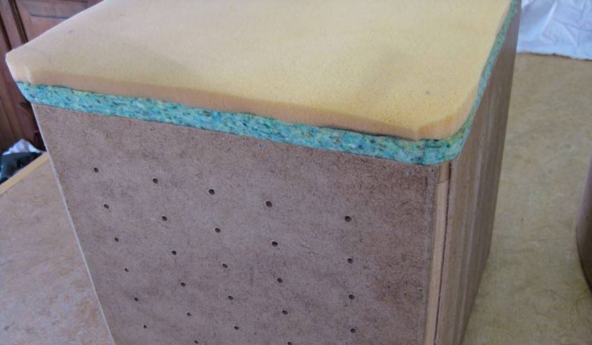 Затем необходимо приступать к обивке боковых сторон сидения. Для этого используется поролон. Из него вырезается прямоугольник и приклеивается к боковым стенкам будущего сидения. На фото представлены пуфики для прихожей своими руками.