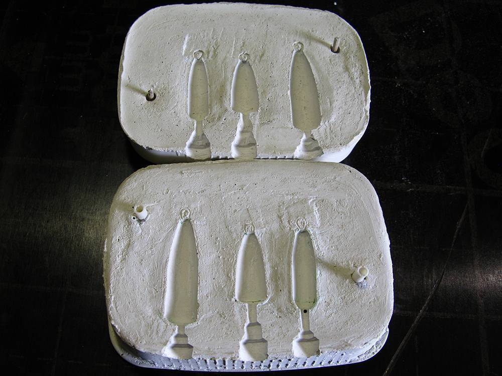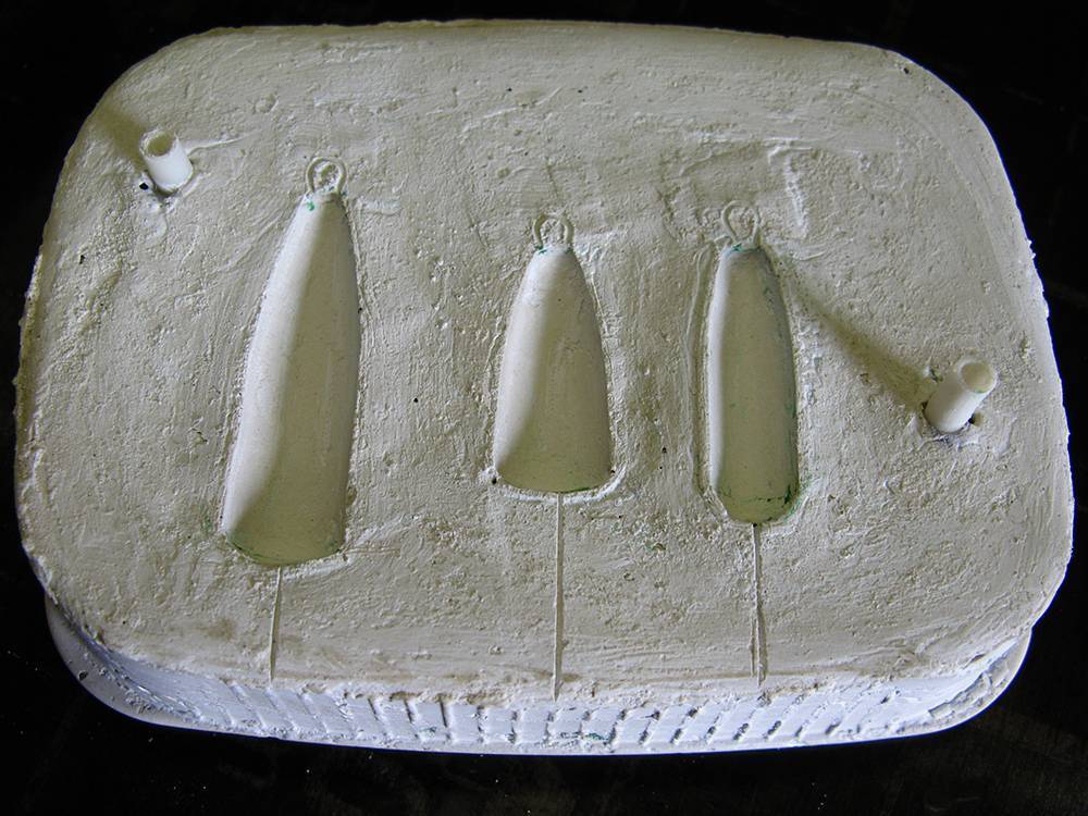 - После высыхания цемента в обеих половинах формы, круглым надфилем растачиваются центральные конусовидные отверстия в каждой половине для заливки свинца, также делается два боковых канала для отвода воздуха;