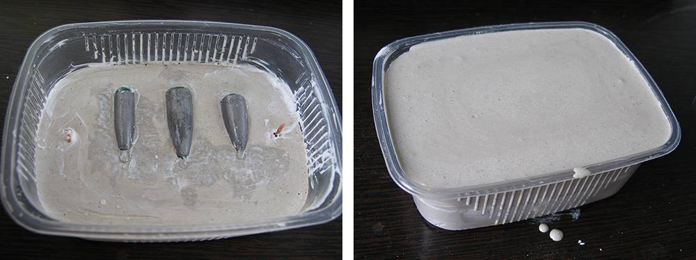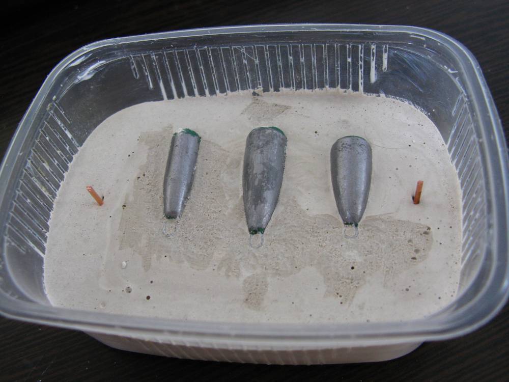 Завершающим этапом в изготовлении приманок является заливка силикона в гипс. Он обычно застывает спустя полтора часа.