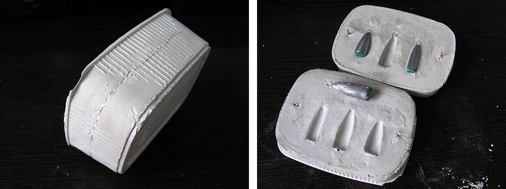 Чтобы гипсовая форма для грузил прослужила дольше, внутри обрабатывают герметической вязкой массой.