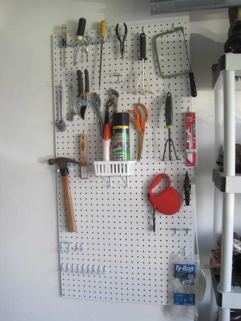 В компактном помещении на стенах можно сделать металлические решётки, использующиеся для компактного хранения инструментов. На решётке с крючками также можно хранить садовый инвентарь и рабочую одежду.