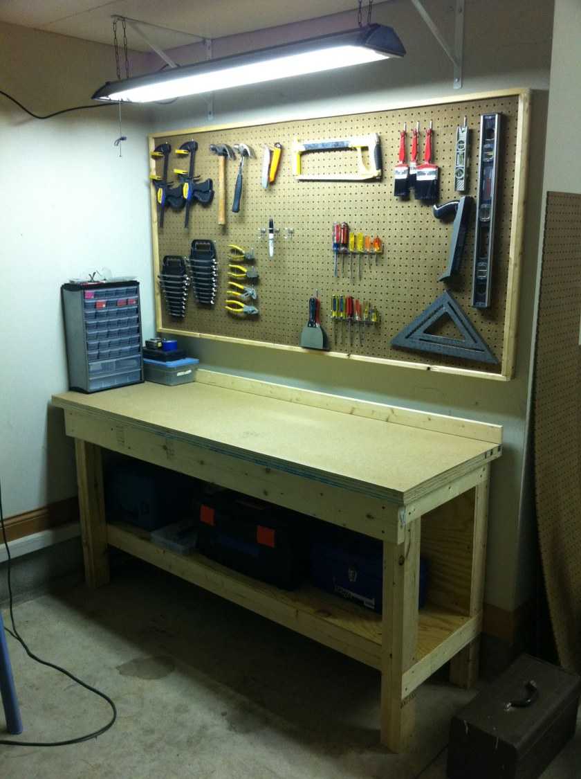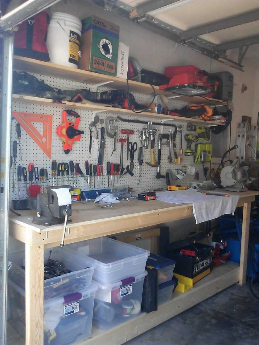 Гараж, как правило, имеет прямоугольную форму, а автомобиль не занимает всё свободное пространство. Поэтому можно обустроить рабочую зону с верстаками, полочками и инструментарием. Для запчастей, инструментов и приборов стоит выделить отдельные зоны.