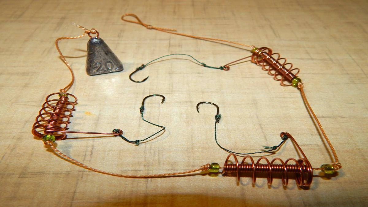 Собрать самому снасть «убийца карасей» несложно. Для этого понадобятся три кормушки, 1 м лески, 3 крючка, небольшой груз, несколько стопоров и вертлюжок.