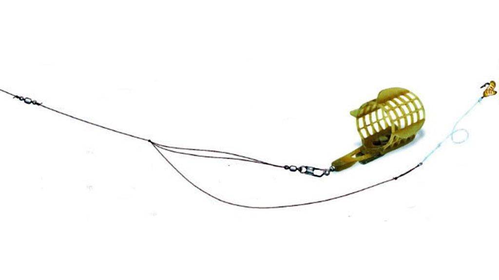При соединении поводков крючками, следует расположить узловую часть посередине. Петля, расположившаяся в верхней части, разделяется на 2 петельки одинакового размера и надевается на штырь кормушки, пройдя сквозь кольцо. Обязательно тщательно затянуть в исходной части пружины.