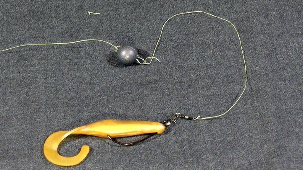 - Подбираем крупную пулю с весом в 1,5 раза больше обычного грузила и устанавливаем на леску.