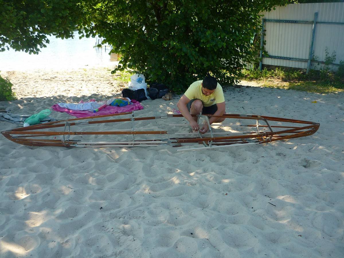 До этого занимался байдаркой в лабораторных условиях – в окружении инструментов и станков. Пришло время испытать ее в полевых условиях.В принципе, сборка деревянного каркаса занимает столько же времени, как среднестатистической Таймени. Если та Таймень бывалая и без крепкого слова и твердой руки не поддается. Здесь все точно также.