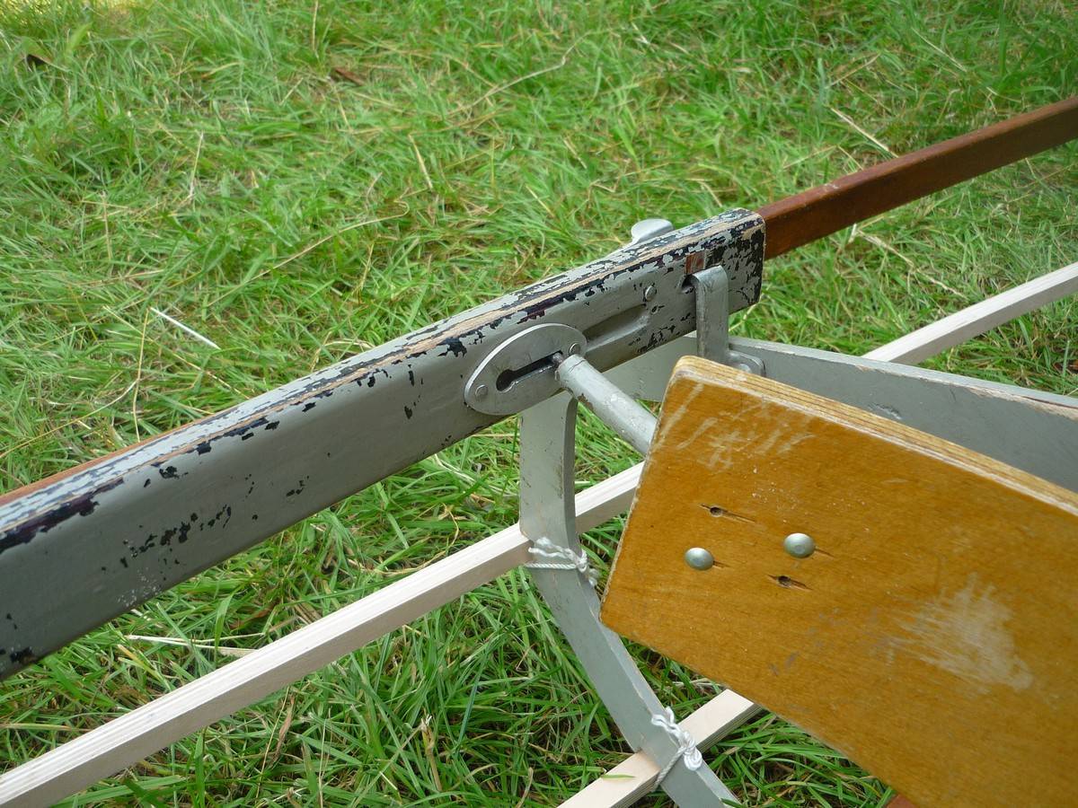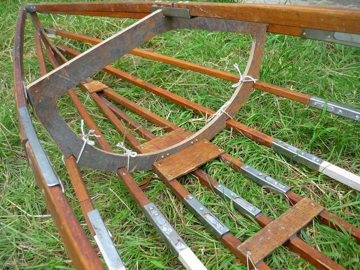 Штевни сделаны из фанеры 9 мм. На концах стрингеров заклепками закреплены дюралевые пластины, которые свободно закреплены на штевнях болтами. Здесь же видим концевую секцию кильсона.