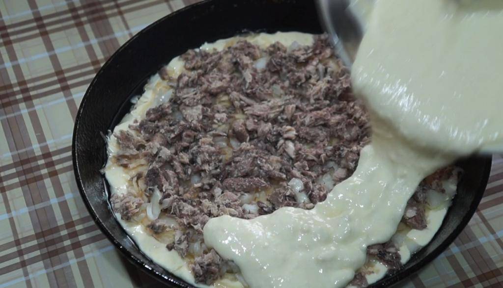 - Начинают формировать заливной пирог на майонезе с рыбными консервами. В специальную форму вливают половину теста.