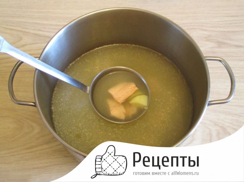 - Готовый бульон процедить и уже на нем варить уху из горбуши.