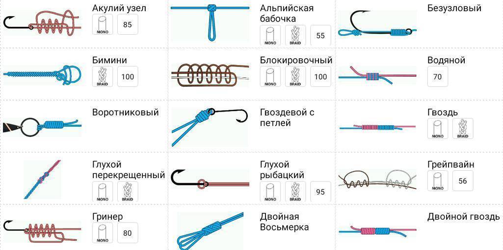 Использование перечисленных далее узлов обеспечивает качественное и надёжное привязывание крючка с плетенкой. Научившись вязать такие узлы, рыбак может чувствовать себя уверенно даже при ловле крупной рыбы.