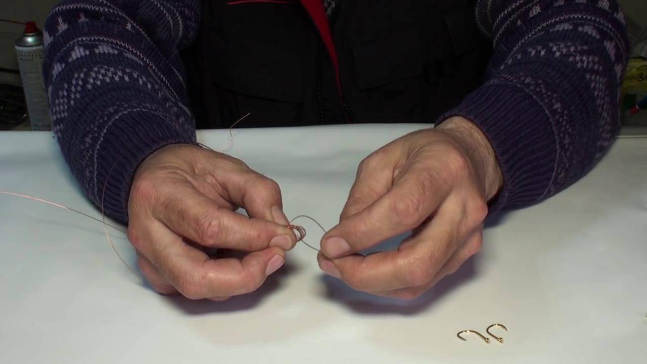 - Вокруг первого крючка (основания) наматывается леска, в получившиеся витки продевается свободный конец и слегка затягивается;