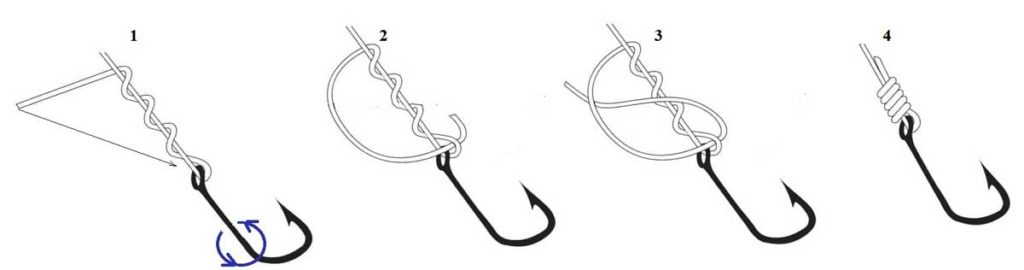 Соответственно, узел, в котором нужно пропускать леску в ушко, не подойдет для монтажа крючка с лопаточкой. Из наиболее подходящих узлов для привязывания плетенки к крючку следует выделить несколько способов.