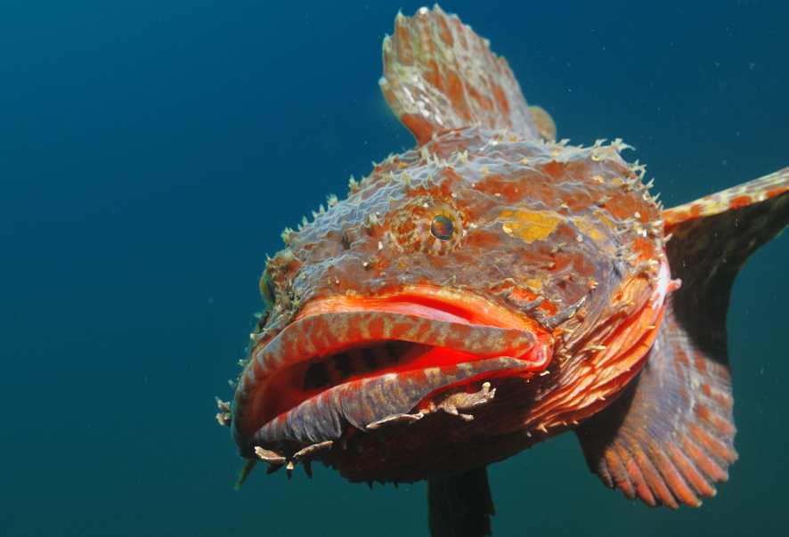 - Рот с мощными зубами в виде шипов или пластин, которыми хищная рыба (кузовки, скаты, орляки, зубатки) дробит твердый панцирь беспозвоночных (моллюски, кораллы).