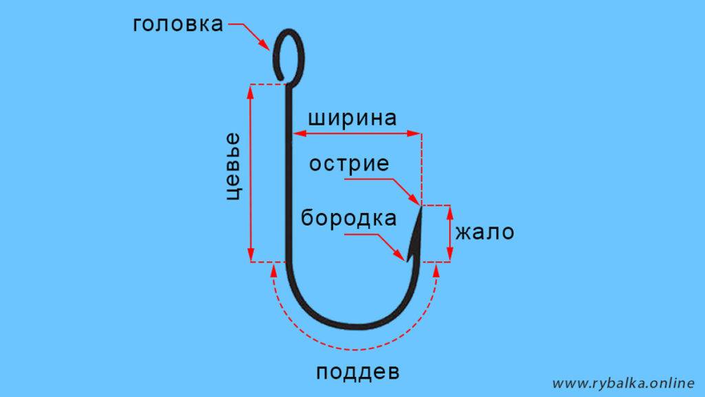 Строение рыболовного крючка: головка, цевье, острие, бородка, жало, поддев