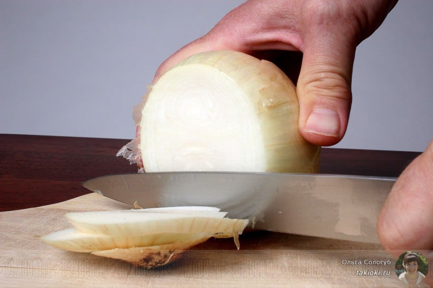 Шаг 5. Луковицу настругайте полукольцами. Поджарьте до румяности.