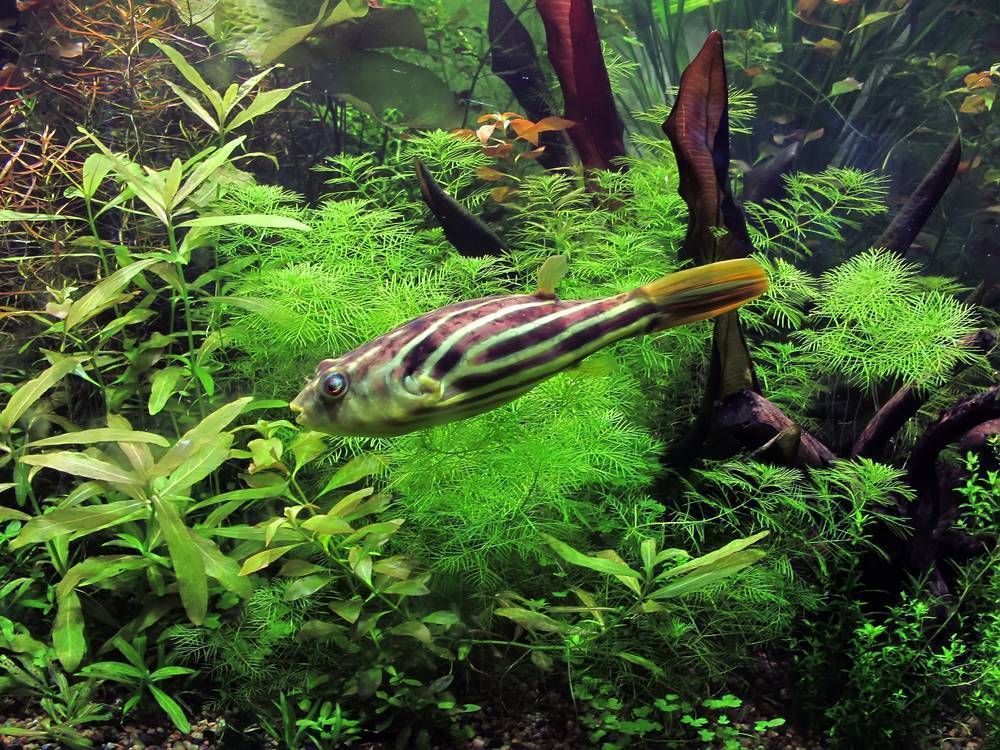 А вот маленьким рыбкам, либо медленным и обладающим вуалевыми плавниками, вполне может достаться множество неприятных мгновений, когда у карликового тетрадона будет желание и настроение их донимать.