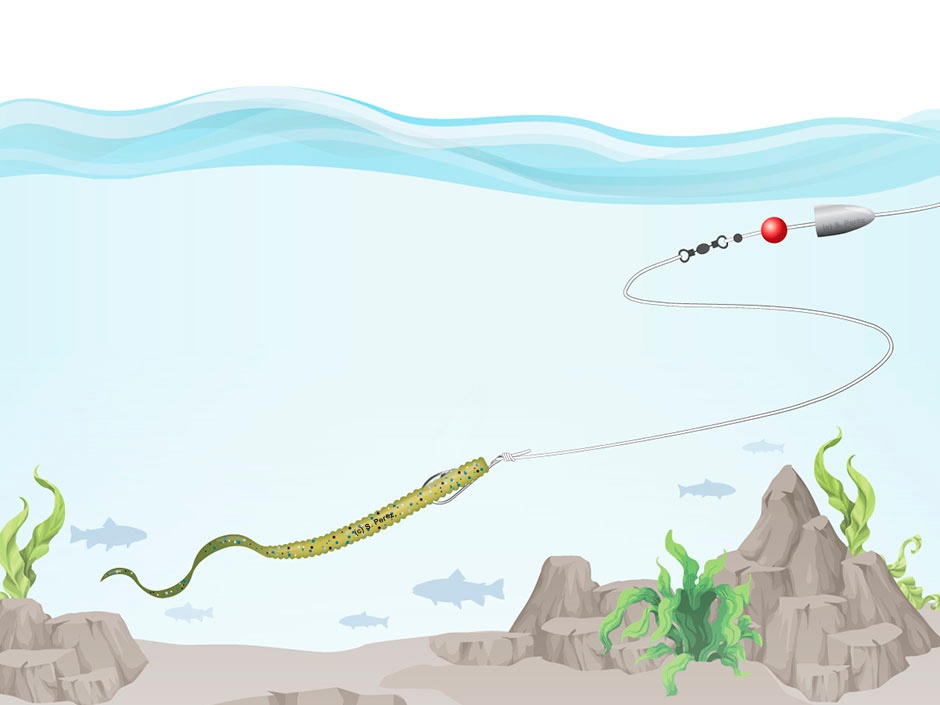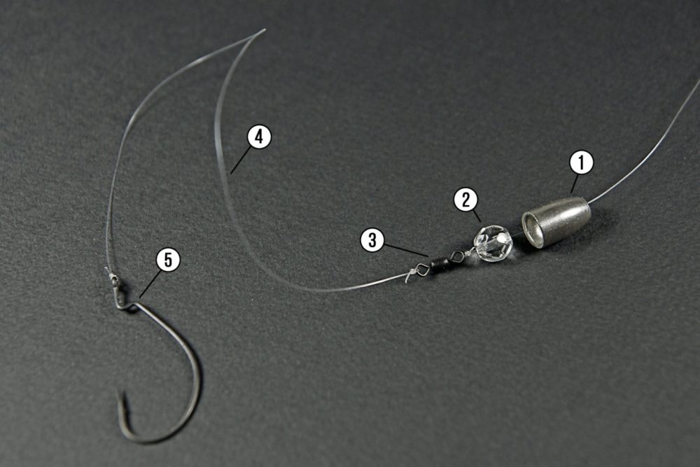 Способы монтажа и применяемые приманки достаточно детально описаны в соответствующей статье. Если вкратце, то к концу отводной лески крепится груз каплевидной формы или, что лучше – дропшотовая палочка. Выше него вяжется вертлюг с длинным поводком из монолески (например, флюрокарбона), к которому в свою очередь крепится приманка. Приманки применяются любые: от твистеров и виброхвостов, до креатур, раков и даже небольших плавающих воблеров с малым заглублением.