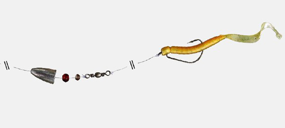 Каролина выглядит как скользящее по основной леске грузило и поводок с приманкой на офсетном крючке. Для амортизации монтируется бусинка между грузилом и поводком.
