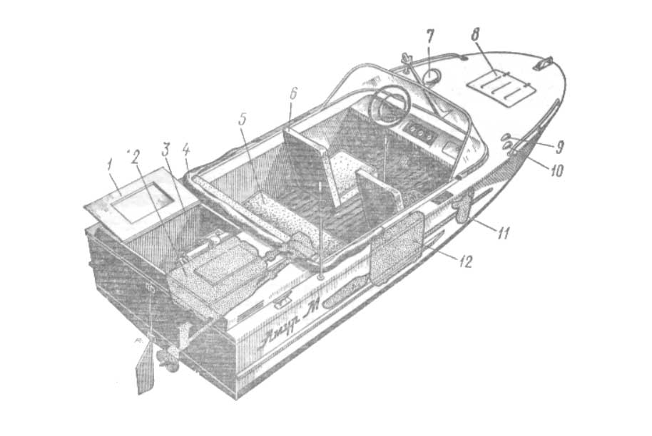 В кормовой части находится моторная камера, под пассажирскими сидениями – редуктор, передающий вращения угловой конфигурации. В этом же отсеке размещены следующие элементы: