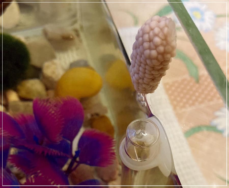 Но так как аквариум теперь сверху закрыт стеклом, икра была отложена ночью на стенку аквариума. Улитка сама сформировала очень красивую кладку. Были явно видны крупные яйца.