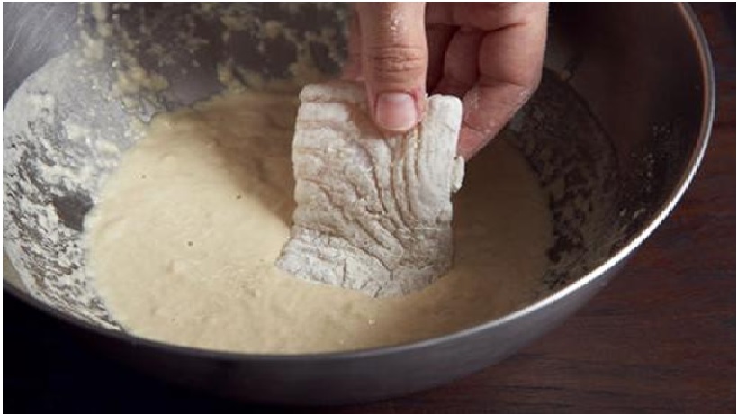 Чтобы поверхность филе полностью покрылась кляром, используют прием предварительного обваливания ломтиков мукой или крахмалом.