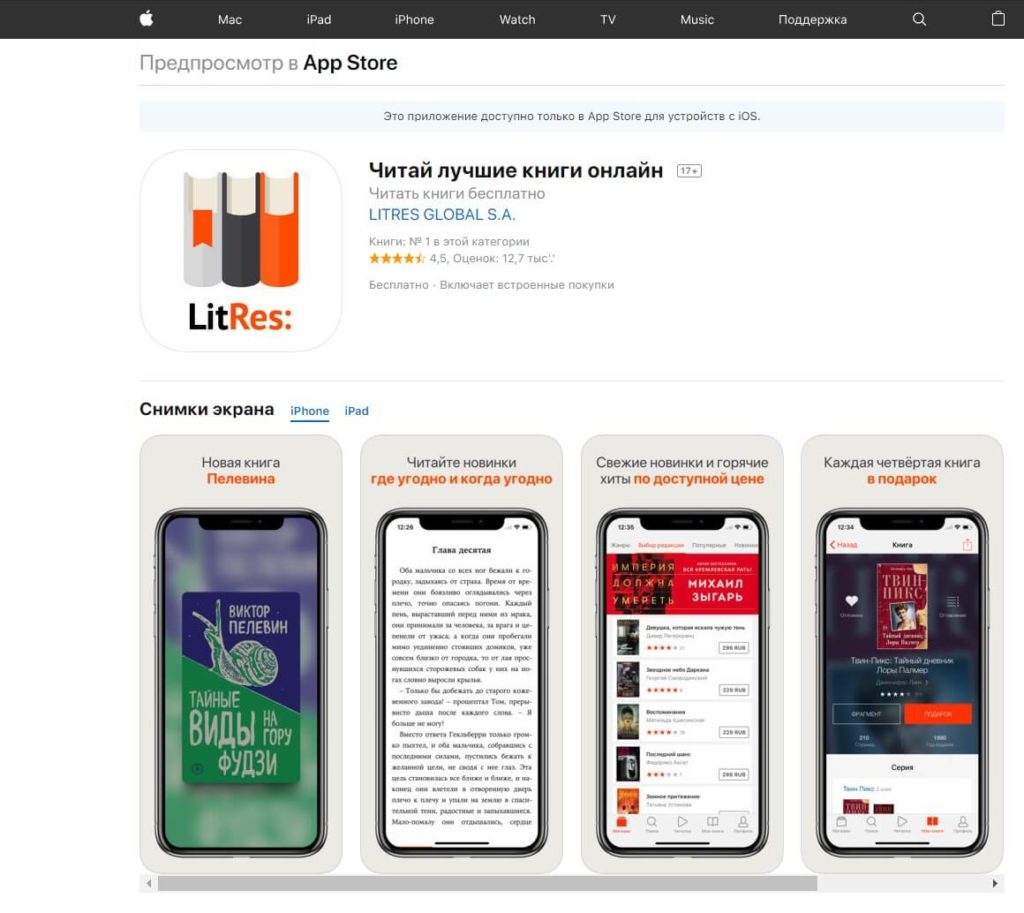 Разработчиками сервиса «Литрес» предусмотрено мобильное приложение, благодаря которому можно читать любимые произведения с экранов смартфона и планшета.